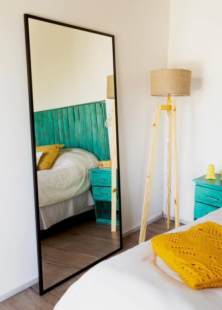 Espejo rectangular 100% cristal, con marco de Hierro Ángulo (no es chapa plegada) pintado al horno. Incluye arandelas de hierro soldadas para colgar vertical u horizontal.