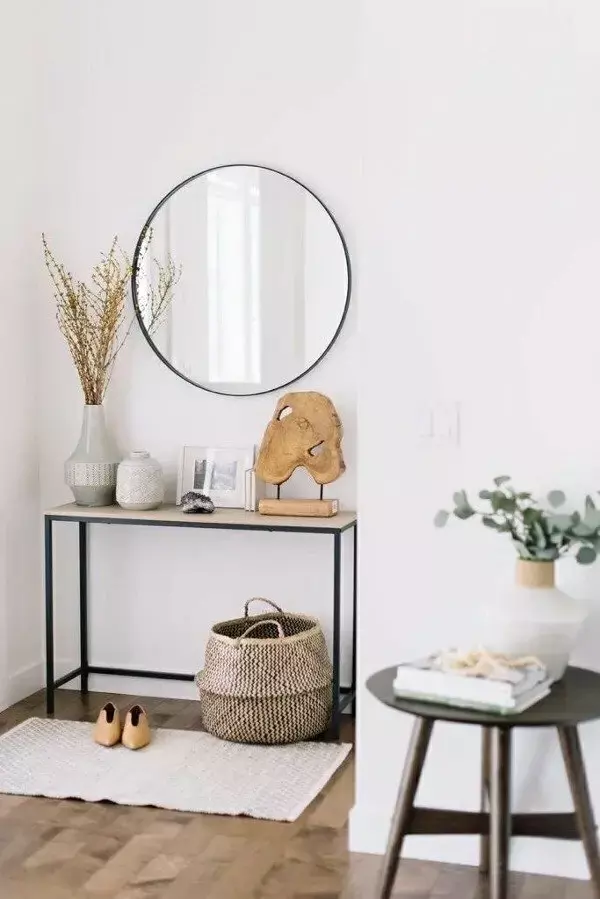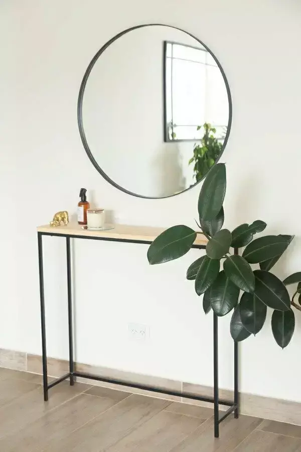 Recibidor simple de un estante, fabricado en hierro pintado al horno y madera de pino elliottis virgen cepillada (no viene pintada) .